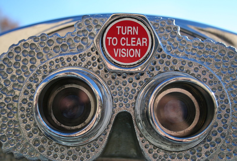 Picture credit: ‘Turn to clear vision’ by rachaelvoorhees on Flickr, https://flic.kr/p/4eA8Mf (CC BY-ND 2.0). Description: colour close-up photo of a public coin-operated telescope (or binoculars) of the kind found in panoramic tourist spots. Between the silver eyepieces, there is a hexagonal lever bearing the following words ‘TURN TO CLEAR VISION’ in striking white capital letters on a red ground.